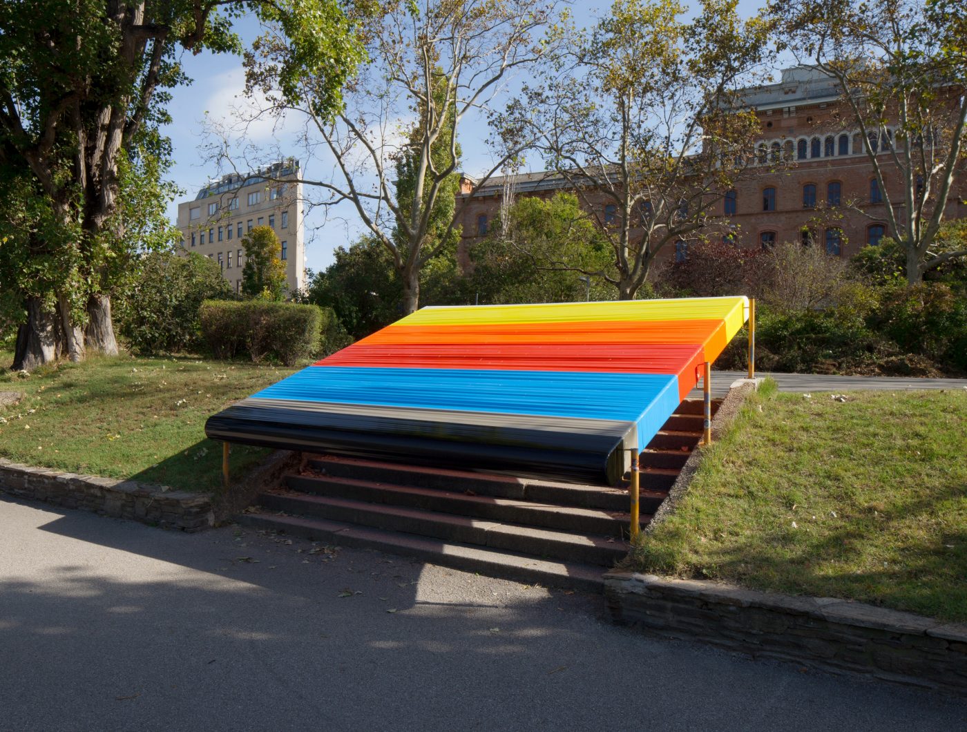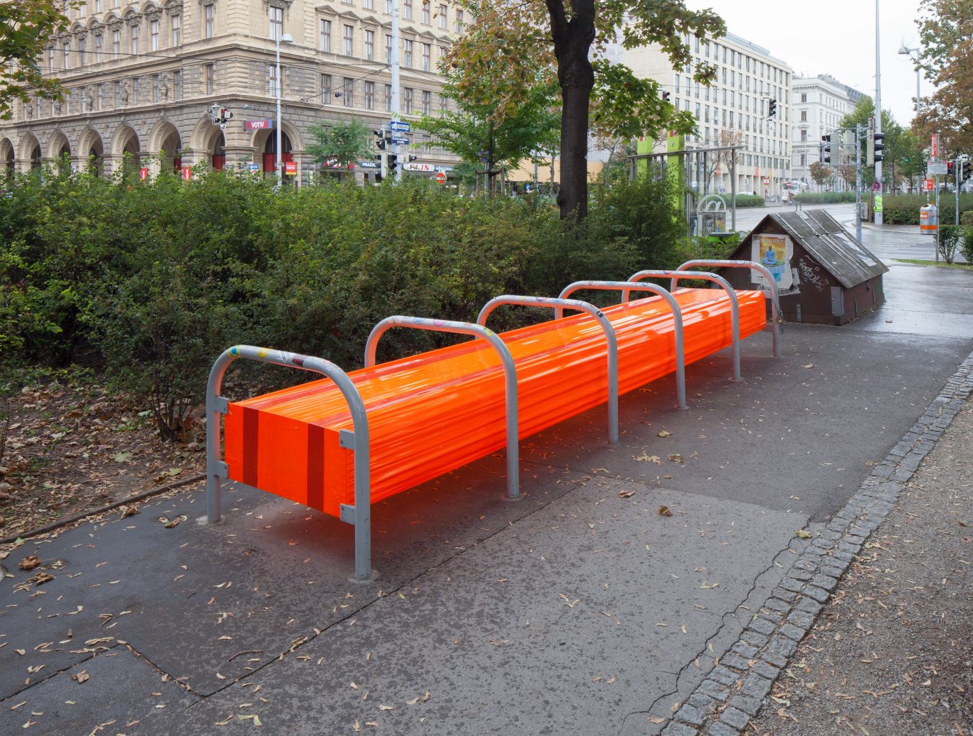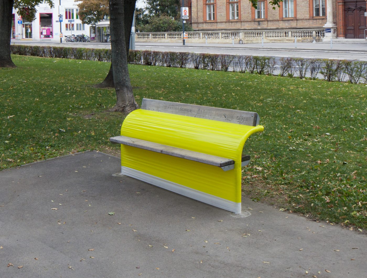 Marlon de Azambuja is a Brazilian artist who now lives and works in Madrid. He uses a wide variety of media for his work; in addition to photography, video, drawing and sculpture, installations and interventions in the public space play a central role in his oeuvre. These installations are created through simple but effective interventions using everyday materials. In one of his current series Potencial Escultórico (Sculptural Potential), he uses colored adhesive tape to wrap urban furniture. On the one hand, this renders the furniture temporarily unusable; on the other hand, de Azambuja’s emphasis of forms and contours draws attention to structures which are often overlooked. Municipal authorities, urban planners and architects not only define the appearance of a city, they also dictate our behavior in the public space.